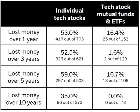 Now consider what happened when investors accessed that same sector through a diversified vehicle - a mutual fund or ETF. Over ten years, not a single technology mutual fund or ETF tracked by Morningstar lost money. Zero out of 73. Over five years, only 16.7% did. The difference between those two outcomes is not the sector. It is the structure.