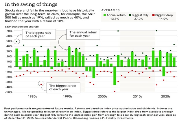 The chart below captures this dynamic better than any words can. Each green bar shows the S&P 500’s final annual return for a given year. The dark green dot above it shows the biggest rally within that year. The red dot below shows the biggest decline. What becomes immediately clear is that every year, even the strong ones, contains meaningful turbulence along the way. In 2025, for example, the market fell as much as 19% at its worst point before finishing the year up 18%. That intra-year decline felt alarming in the moment. In hindsight, it was the setup for the rally that followed. The red dots are not the story. The green bars are