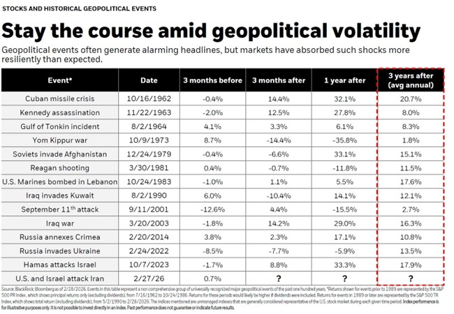 Looking back at major geopolitical shocks, from the Cuban Missile Crisis to the September 11th attacks to Russia’s annexation of Crimea, markets have shown a remarkably consistent pattern: short-term disruption followed by recovery. Even events that felt, in the moment, like potential turning points for the global order proved temporary in their market impact.